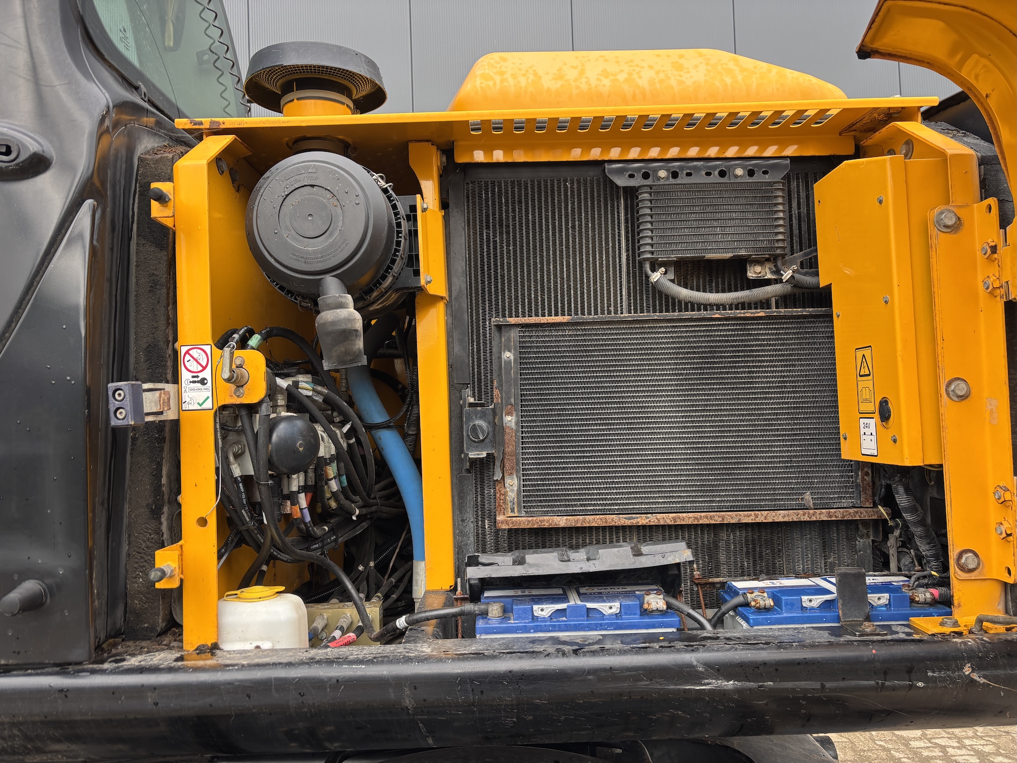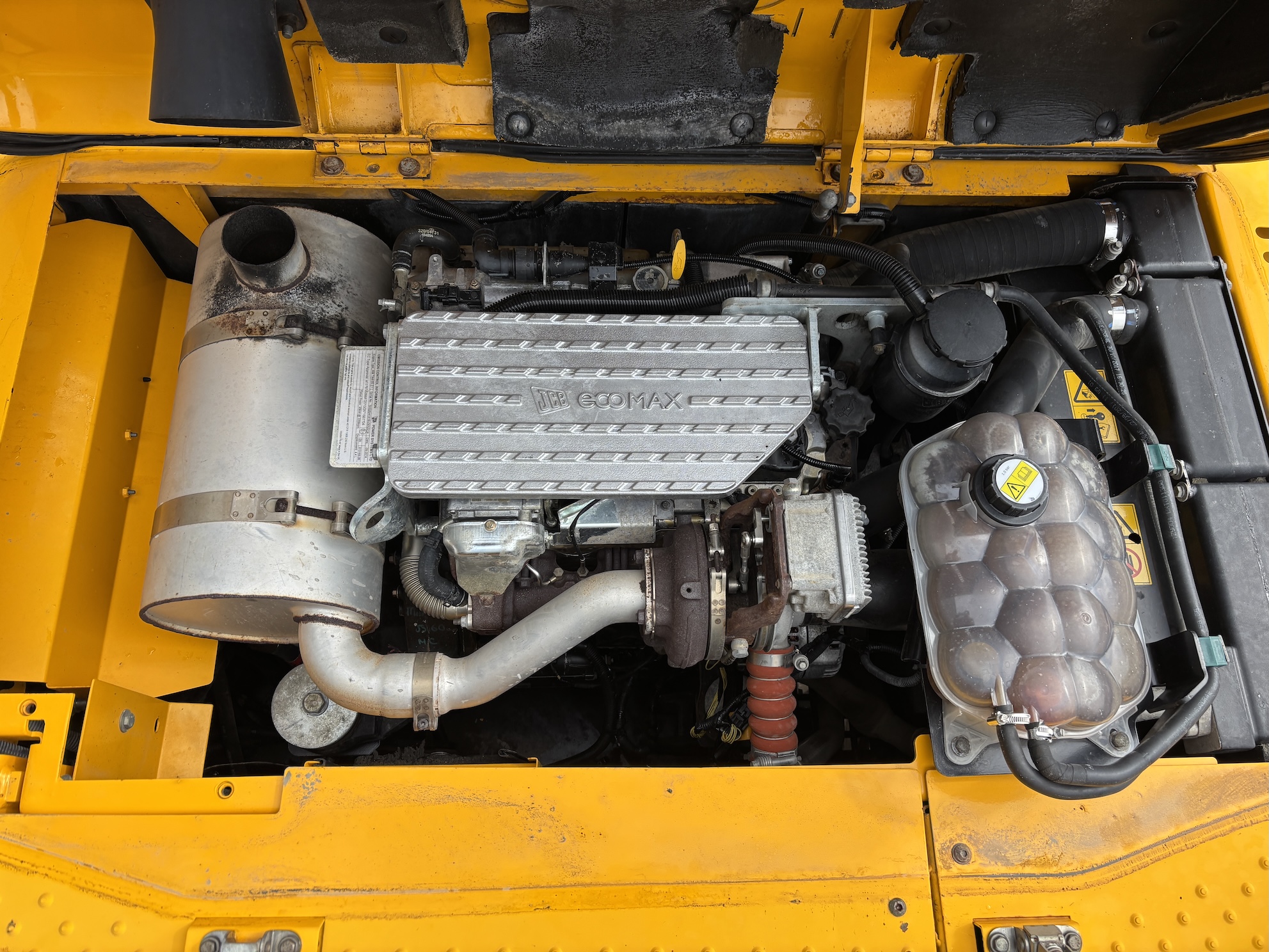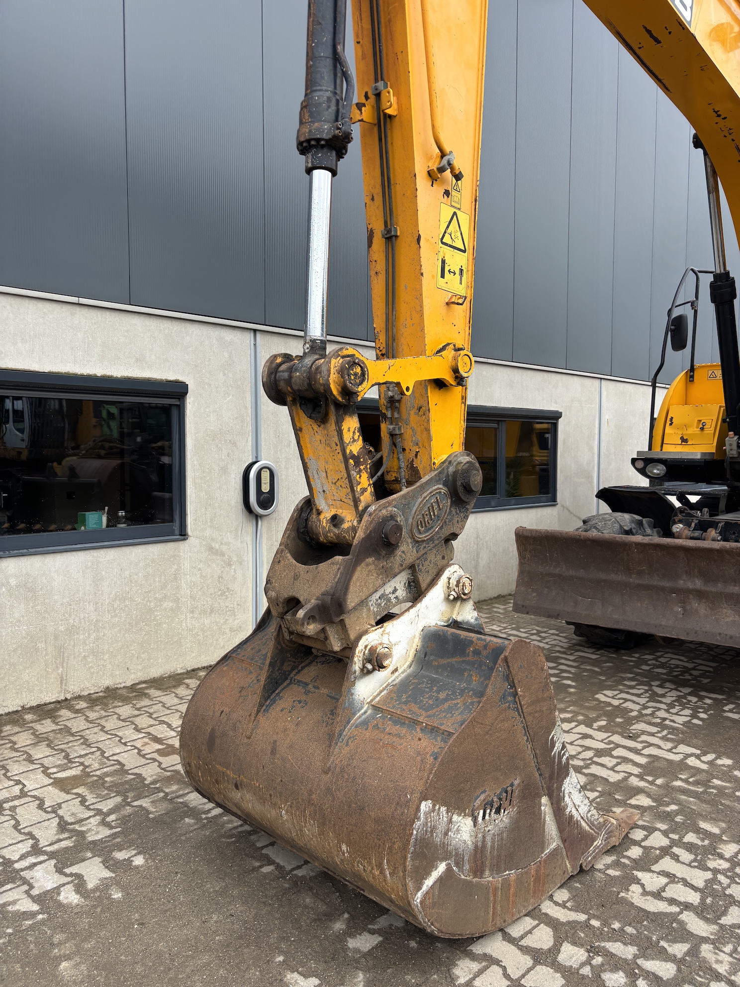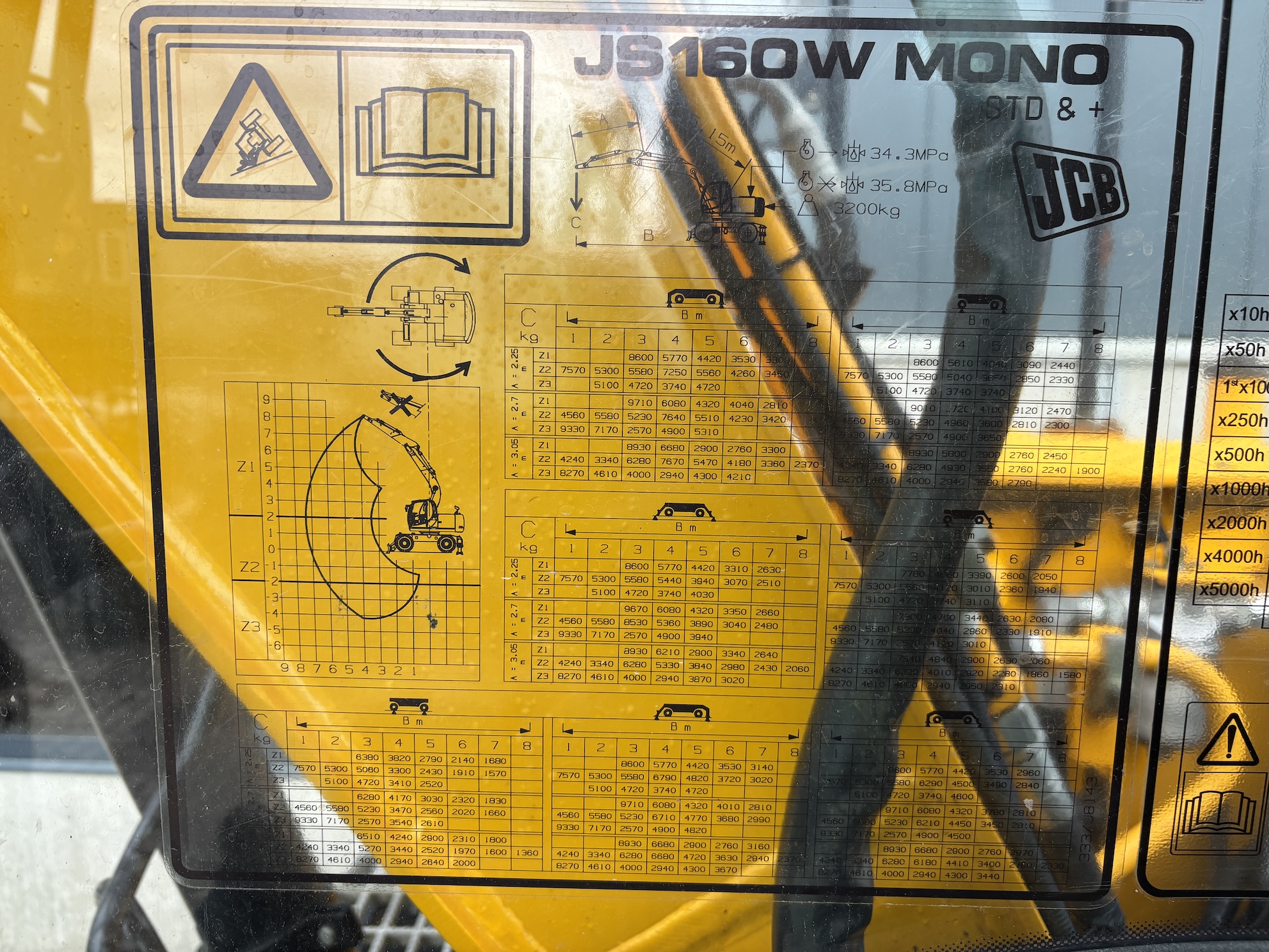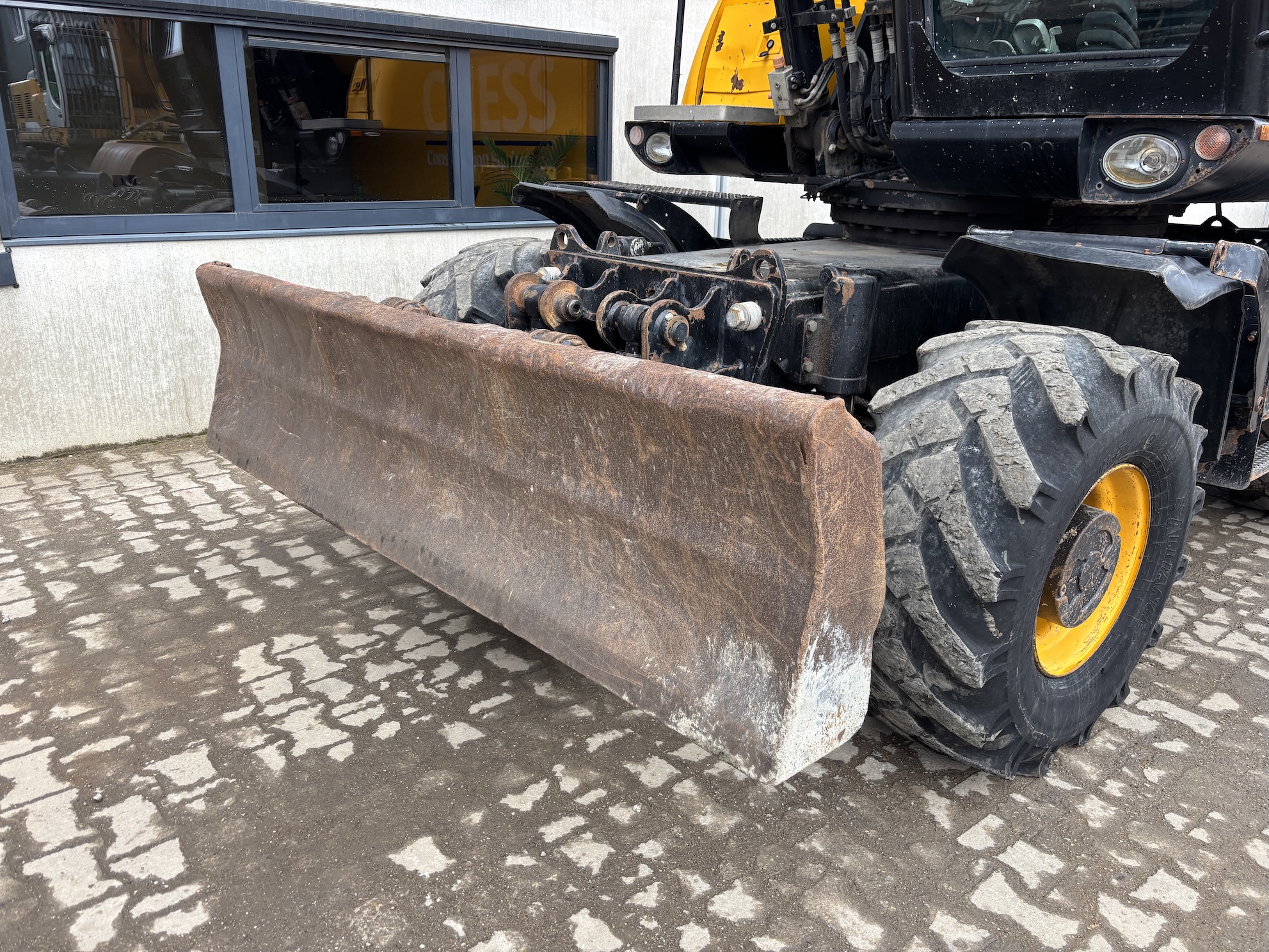This JCB JS160W is equipped with a 4 cilinder turbo charged JCB ECOMAX 444 TA4i-93 E (93kW) diesel engine with 7327 hours on the service meter. Machine has a hydraulic dozer blade, 2 outriggers, monoboom, hydraulic quick hitch, digging bucket, hydraulics for hammer, check valves, extra work lights, rear view camera, airco, radio etc.